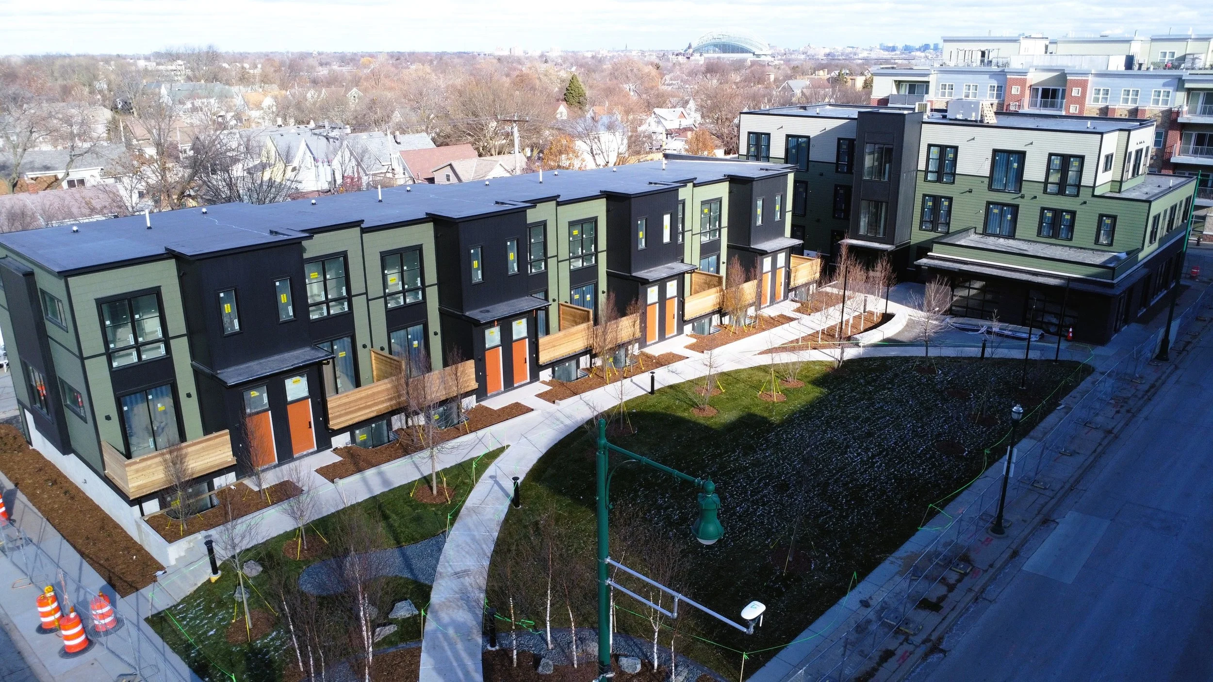 “Missing Middle Housing” development with 8 rental townhomes, 11 apartments and a 2,500 sf restaurant space in West Allis, Wisconsin.